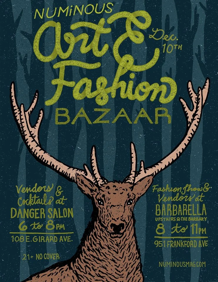 This poster was created for an event for Numinous Magazine. Featuring hand-drawn art that has been digitally arranged and colored. Standing on a background of trees that read as a striped pattern, a stag catches the viewers eye and also provides organization to the text. As this was an event taking place at two separate locations, I kept them on similar hierarchies organizing further utilizing text style. To stand out from the crowded forest of posters with a red and white seasonal palette, I choose dark earthy colors. Still fitting for the dark half of the year.
